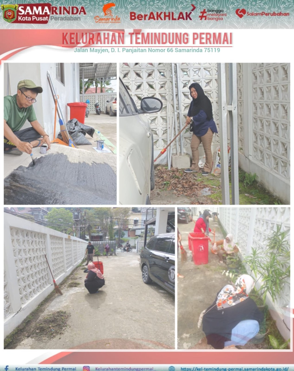 WUJUD KEBERSAMAAN MEMBANGUN LINGKUNGAN KERJA YANG BERSIH DAN NYAMAN November 17, 2025 Kota Samarinda, 14-11-2025 Pukul 08.00 wita s/d selesai Tempat Lingkungan Kelurahan Temindung Permai Kegiatan Gotong Royong ; Jumat 14 November 2025 Kelurahan Temindung Permai melaksanakan giat gotong royong bersama seluruh staf kelurahan. Kegiatan i...